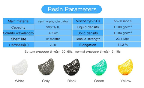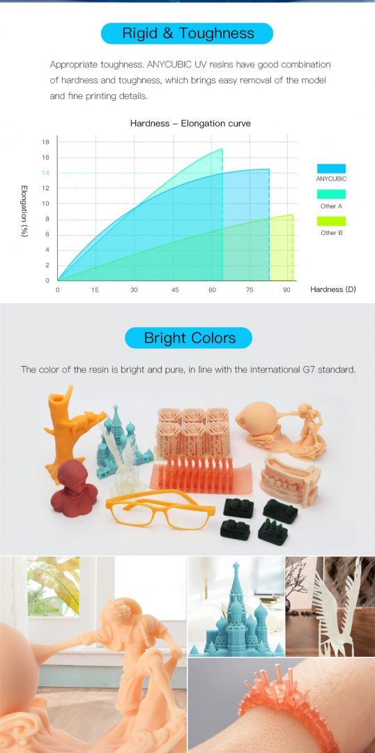 Żywica jest stabilna w różnych warunkach klimatycznych, a także łatwa w przechowywaniu, pokonując wady innych żywic, które łatwo mogą pochłonąć wilgoć, zmiękczają się i powodują korozję środowiskową. Żywica jest przeznaczona do modelu LCD, niezalecana do modeli DLP lub SLA. Zapewnia wytrzymałość wyprasek i brak nadmiernego skurczu, ale także poprawia szybkość druku, skraca czas utwardzania i maksymalnie zwiększa wydajność druku LCD.