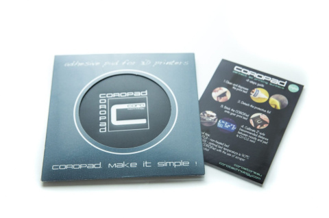 COROPad jest specjalną podkładką ułatwiającą adhezję materiału w drukarkach 3D w technologii FFF i FDM. Podkładka stanowi idealną powierzchnię do druku. Pracuje z większością materiałów dostępnych na rynku. Zapewnia prawidłowe przyklejenie pierwszej warstwy, co powoduje że wydruki idealnie trzymają się powierzchni. Bardzo dobrze sprawdza się przy podstawowych materiałach takich jak ABS czy PLA. Współpracuje także z materiałami bardziej zaawansowanymi. Wysokotemperaturowy klej, oraz sztywność podkładki, umożliwiają szybki i prosty montaż podkładki na stole. Należy umyć i odtłuścić stół roboczy a następnie przykleić podkładkę. Całość zajmuje kilkadziesiąt sekund.