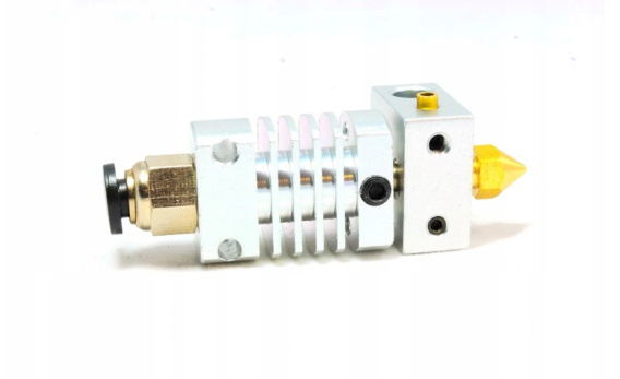 Hotend all metal bez rurki PTFE do drukarek typu Ender, Alfawise, CR10 i podobnych, szeroko stosowany w wielu Chińskich konstrukcjach. Składa się z boku grzejnego o wymiarach 20x20x10, dyszy stożkowej o rozmiarze 0.4 mm, łącznika stalowego bez rurki PTFE, radiatora i złączki bowden PC4-M10 czyli rurka 4 mm średnicy i gwint M10 do radiatora.