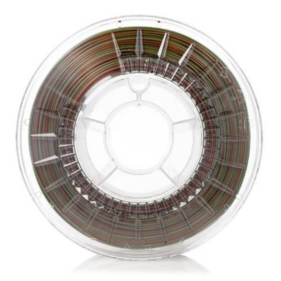Filament PLA Rainbow Army Forest firmy Rosa3D pozwala przygotować wydruki 3D o niepowtarzalnej kolorystyce. Każda szpula zawiera wielobarwną żyłkę w ognistych odcieniach: khaki, oliwkowej zieleni i brązu.  Dzięki zastosowaniu unikalnego blendu materiałowego na bazie PLA, filament PLA Rainbow Silk Army Forest ma błyszczące wykończenie.