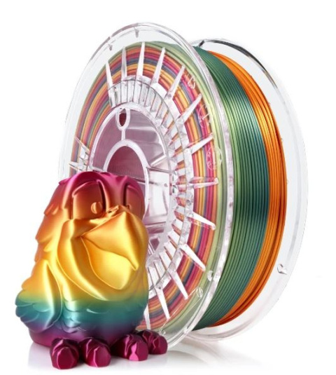 PLA Rainbow Tropical filament from Rosa3D allows you to prepare 3D prints with unique colors. Each spool contains a multi-colored fishing line in fiery shades: orange, yellow, green and purple. Thanks to the use of a unique material blend based on PLA, PLA Rainbow Silk Tropical filament has a glossy finish.