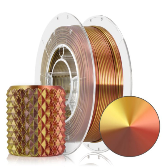 PLA Magic Silk, to filament, który powstał na bazie PLA Silk. Dzięki procesowi koekstruzji, łączy w sobie trzy równoległe kolory w jednej nitce filamentu (złoty, miedziany, brązowy) . Wydruki mienią się kolorami dając dosłownie "magiczne" efekty wizualne.