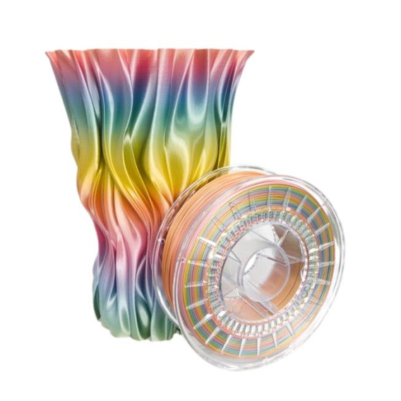 Filament PLA Rainbow Silk charakteryzuje się niskim skurczem, świetną adhezją warstw, bardzo dobrym odwzorowaniem szczegółów i nie ma przykrego zapachu. Przy pracy z tym filamentem, nie wymaga się drukowania w zamkniętej komorze, wysokich temperatur czy zmniejszania prędkości druku. Dzięki zastosowaniu unikalnego blendu materiałowego na bazie PLA, filament charakteryzuje się błyszczącym wykończeniem, które dodaje wizualnej miękkości.